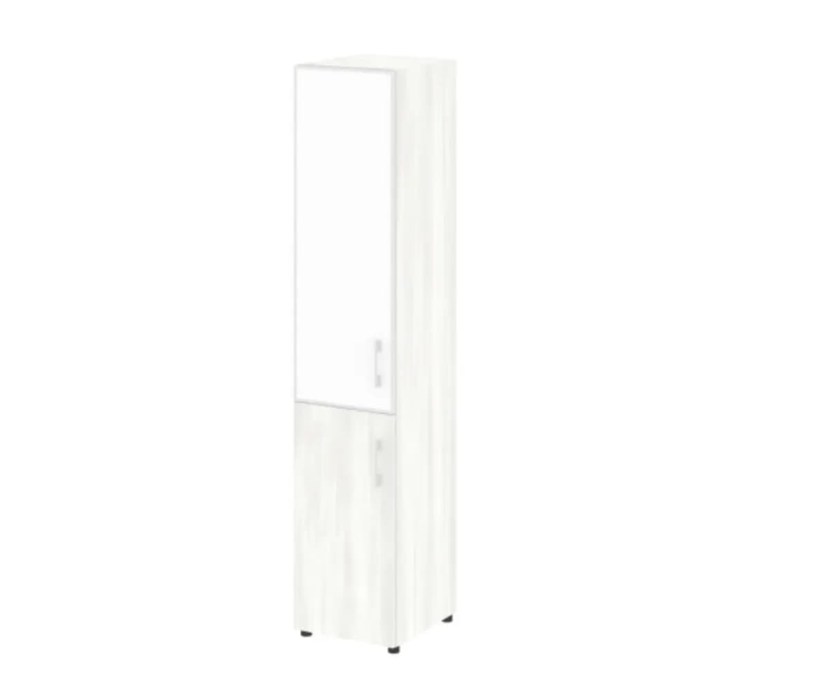 Шкаф высокий узкий левый/правый (1 низкий фасад ЛДСП + стекло в раме белое) снежная патина