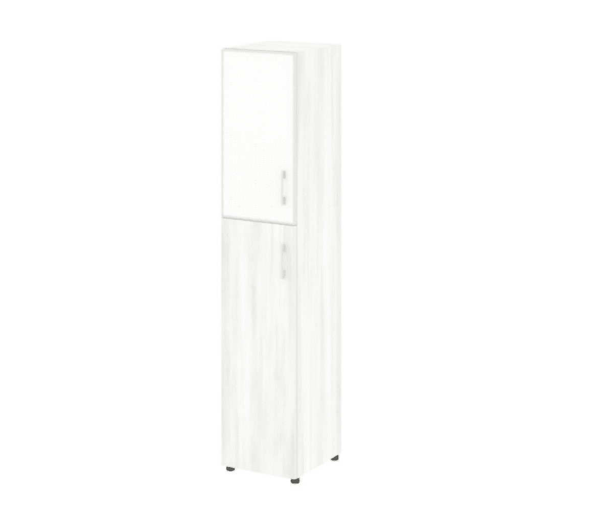 Шкаф высокий узкий левый/правый (1 средний фасад ЛДСП + стекло в раме белое), снежная патина