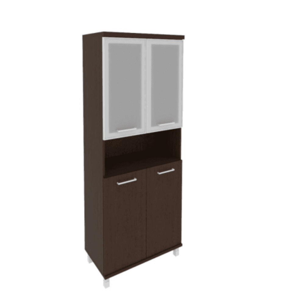 Шкаф высокий широкий (2 низкие двери ЛДСП, 2 низкие двери стекло в раме), венге цаво