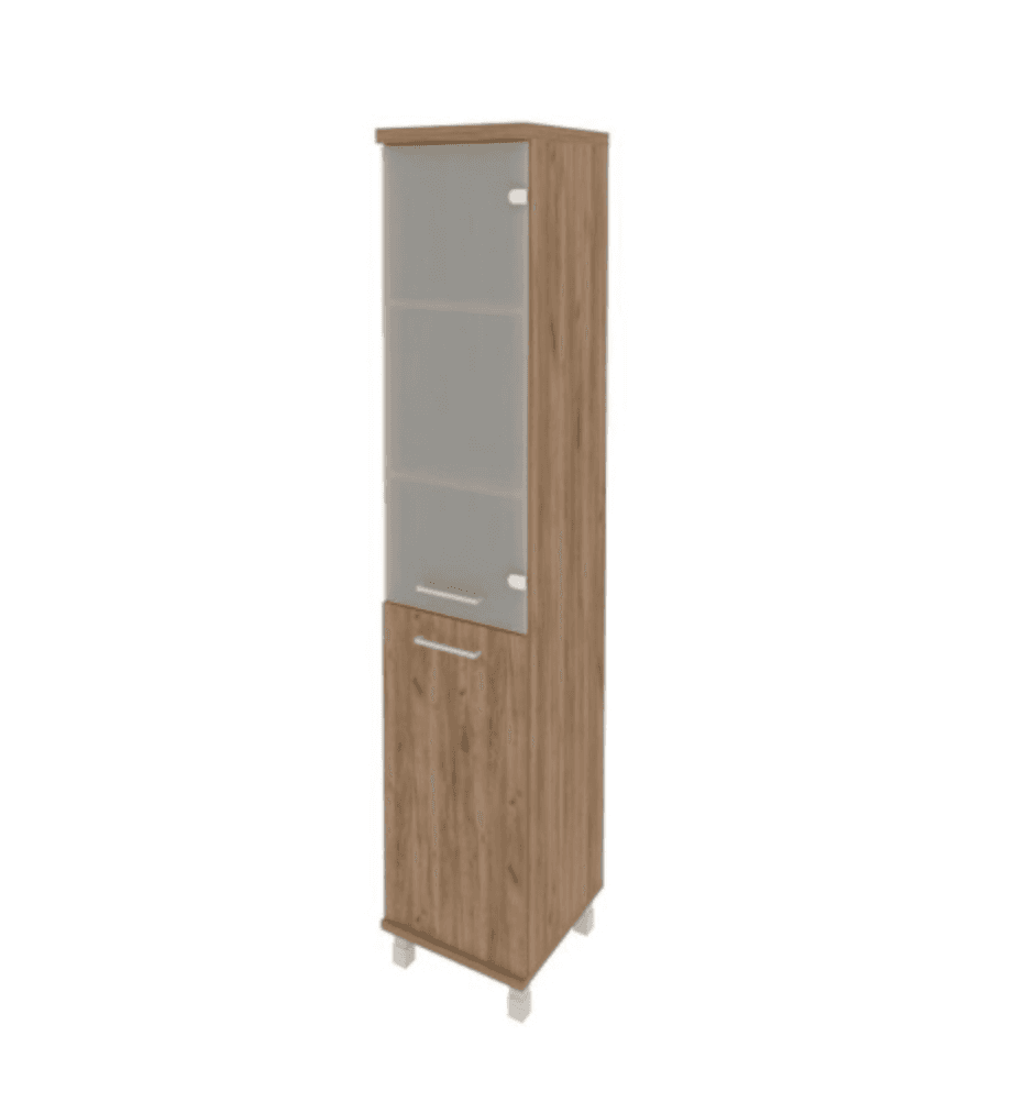 Шкаф высокий узкий левый/правый (1 низкая дверь ЛДСП, 1 средняя дверь стекло), дуб табак