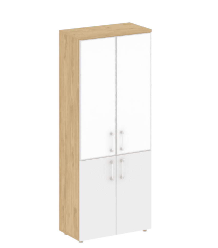 Шкаф высокий широкий (2 низких фасада ЛДСП + 2 фасада стекло Лакобель в раме), тиквуд светлый/белый бриллиант