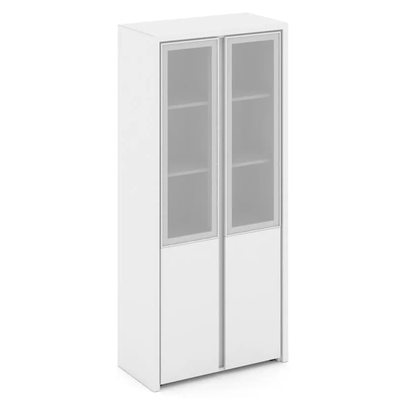Шкаф высокий широкий (2 низких ЛДСП + 2 средних фасада стекло сатин в раме) белый бриллиант