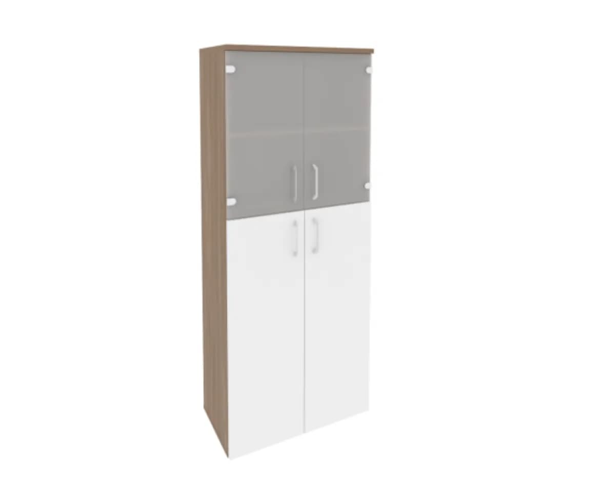 Шкаф высокий широкий (2 средних фасада ЛДСП + 2 низких фасада стекло) фасад белый бриллиант дуб аризона