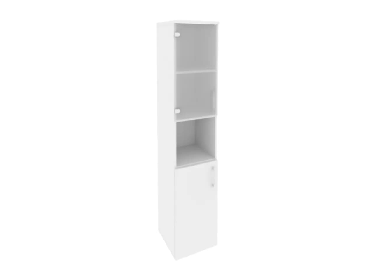 Шкаф высокий узкий левый/правый (1 низкий фасад ЛДСП + 1 низкий фасад стекло) белый бриллиант