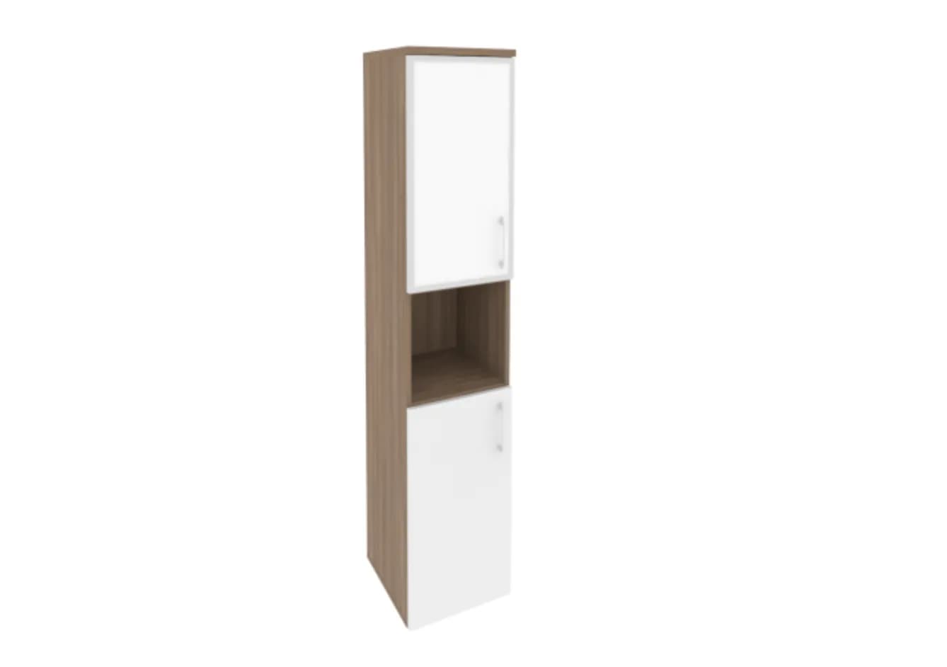 Шкаф высокий узкий левый/правый (1 низкий фасад ЛДСП белый бриллиант + 1 низкий фасад стекло лакобель в раме) дуб аризона