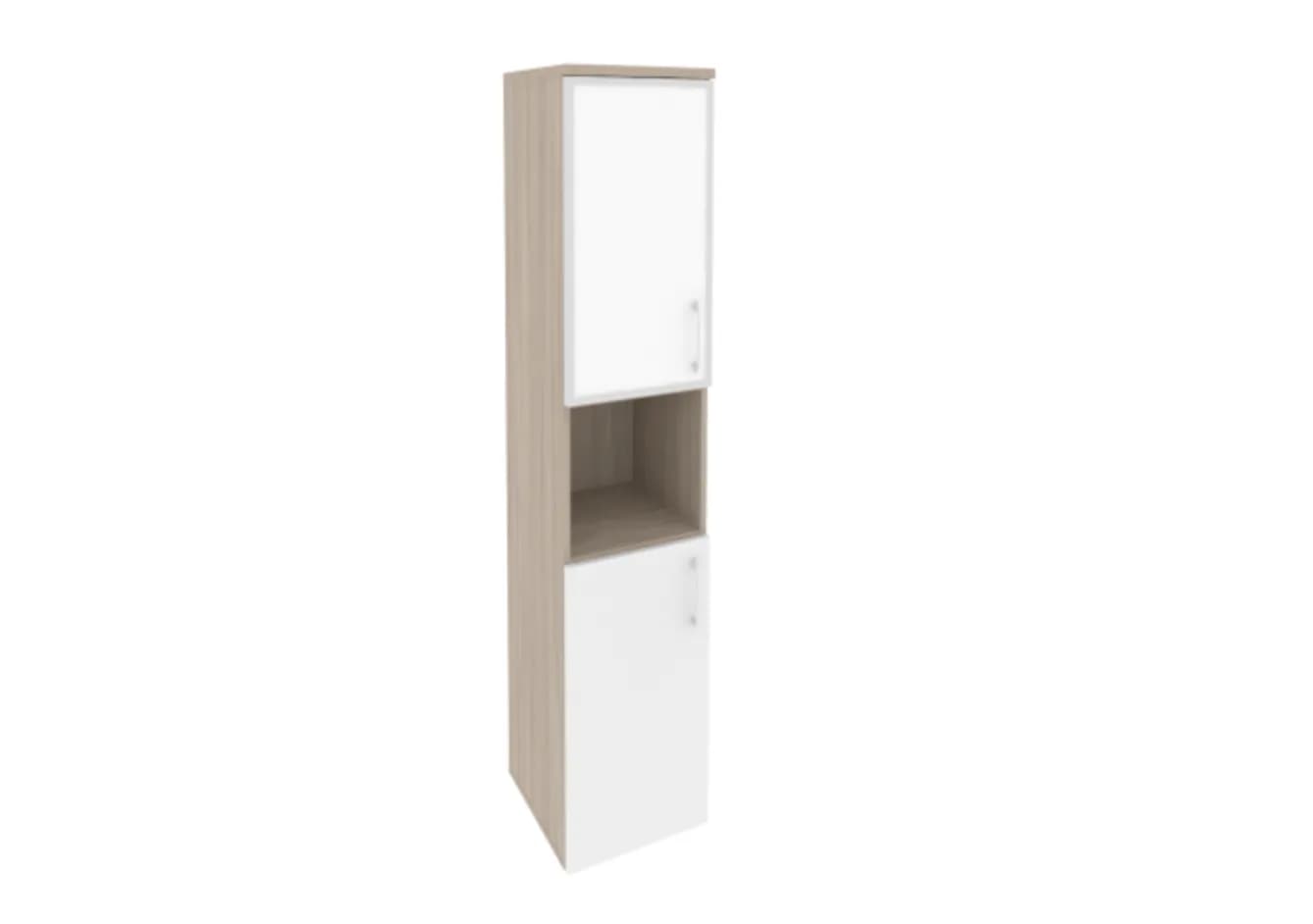Шкаф высокий узкий левый/правый (1 низкий фасад ЛДСП белый бриллиант + 1 низкий фасад стекло лакобель в раме) дуб мали