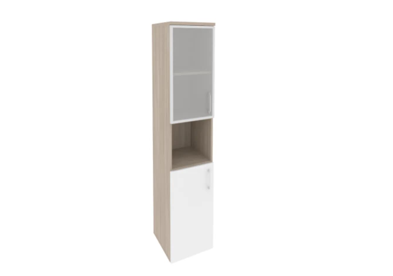 Шкаф высокий узкий левый/правый (1 низкий фасад ЛДСП белый бриллиант + 1 низкий фасад стекло в раме) дуб аттик