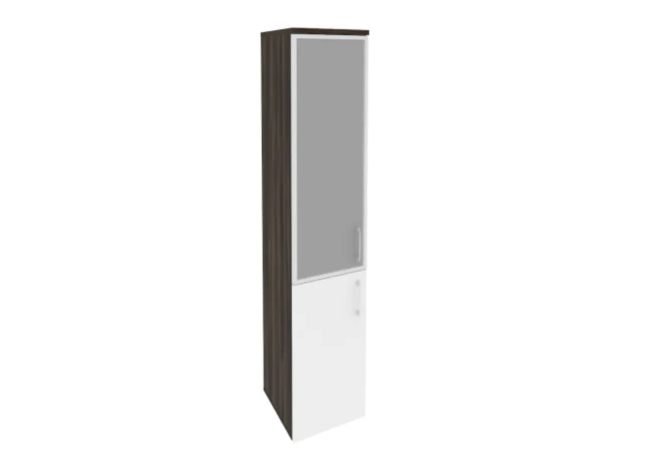 Шкаф высокий узкий левый/правый (1 низкий фасад ЛДСП белый бриллиант + 1 средний фасад стекло в раме) дуб мали