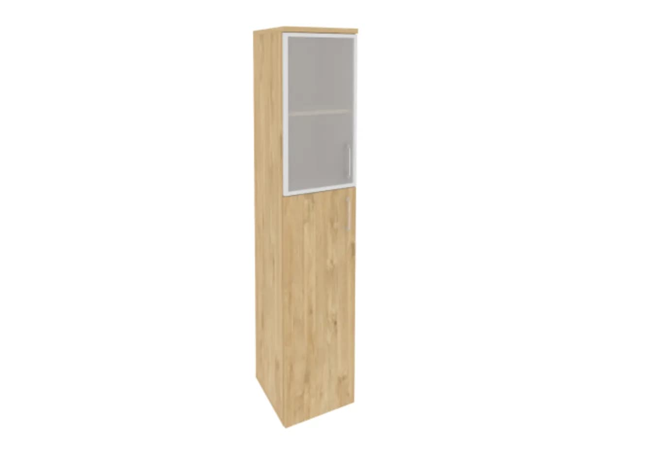 Шкаф высокий узкий левый/правый (1 средний фасад ЛДСП + 1 низкий фасад стекло в раме) тиквуд светлый