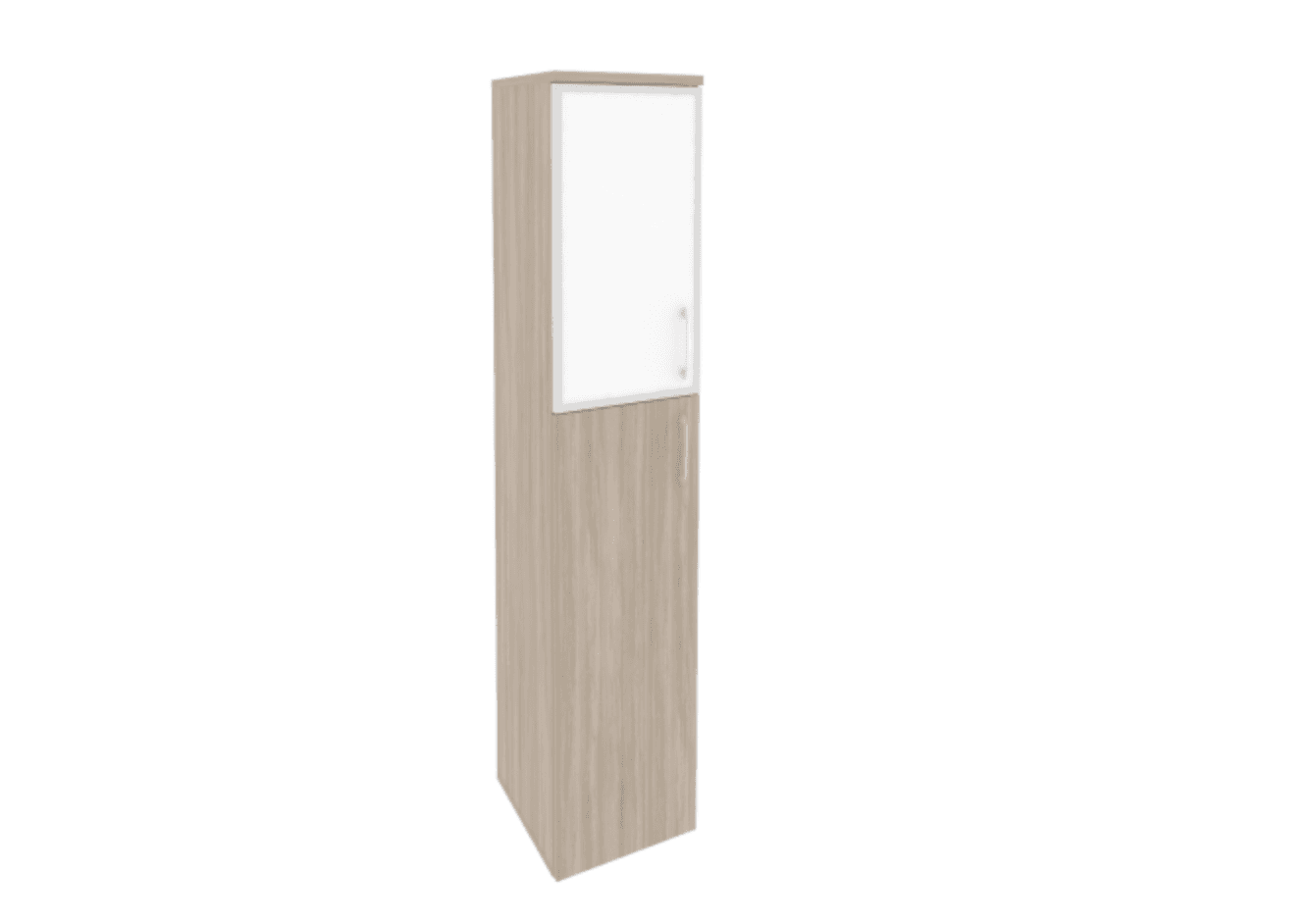 Шкаф высокий узкий левый/правый (1 средний фасад ЛДСП + 1 низкий фасад стекло лакобель в раме), дуб аттик