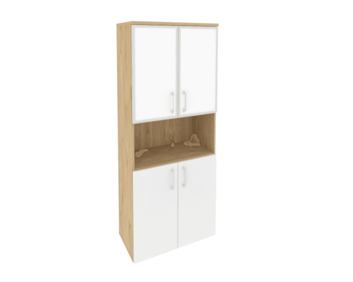 Шкаф высокий широкий (2 низких фасада ЛДСП + 2 низких фасада стекло лакобель в раме) фасад белый бриллиант, тиквуд светлый