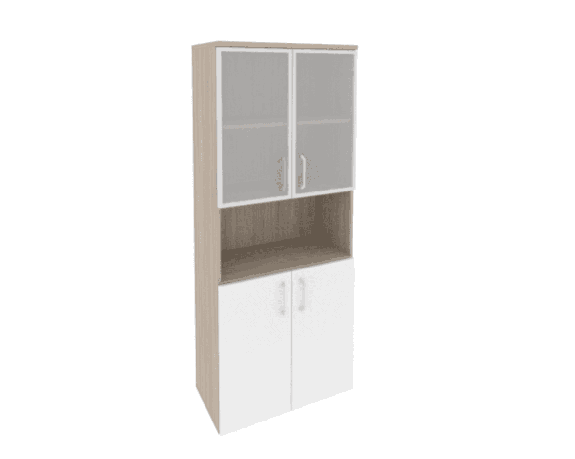 Шкаф высокий широкий (2 низких фасада ЛДСП + 2 низких фасада стекло в раме) фасад белый бриллиант, дуб аттик