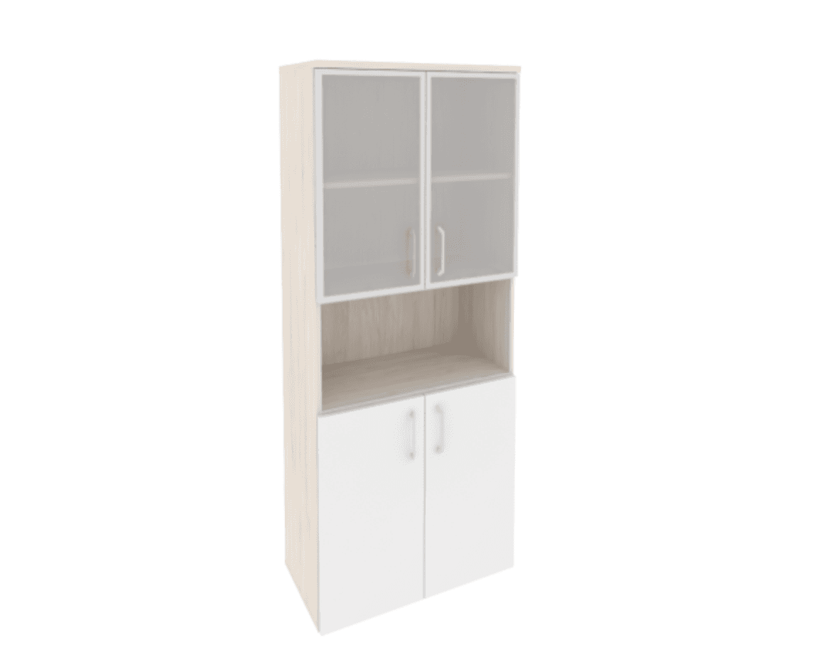 Шкаф высокий широкий (2 низких фасада ЛДСП + 2 низких фасада стекло в раме) фасад белый бриллиант, денвер светлый
