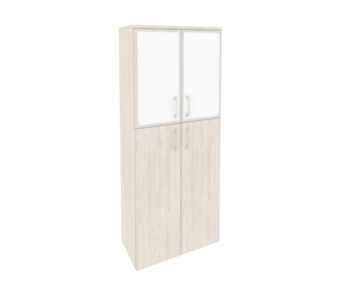 Шкаф высокий широкий (2 средних фасада ЛДСП + 2 низких фасада стекло лакобель в раме), денвер светлый