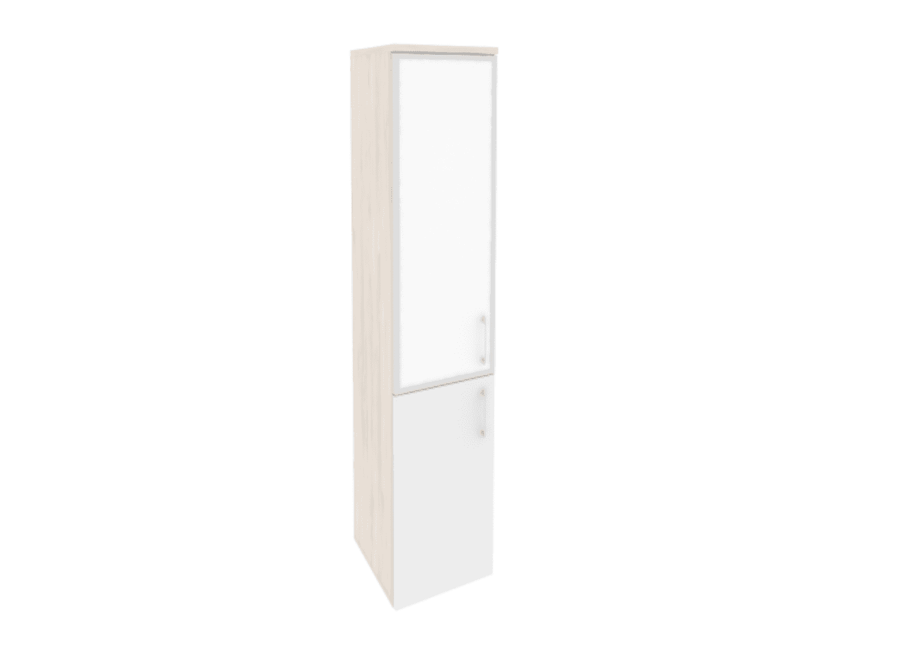 Шкаф высокий узкий левый/правый (1 низкий фасад ЛДСП белый бриллиант + 1 средний фасад стекло лакобель в раме), денвер светлый