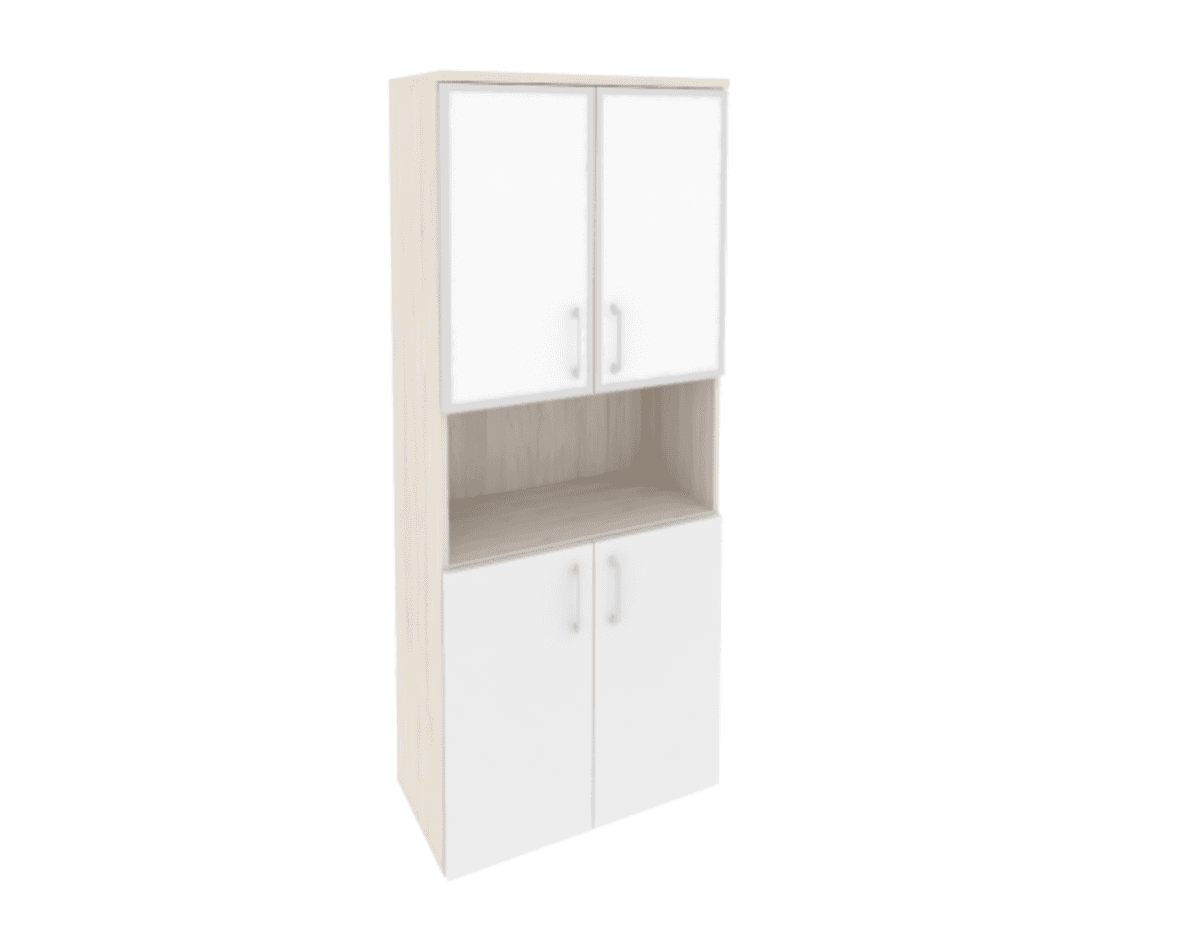 Шкаф высокий широкий (2 низких фасада ЛДСП + 2 низких фасада стекло лакобель в раме) фасад белый бриллиант, денвер светлый