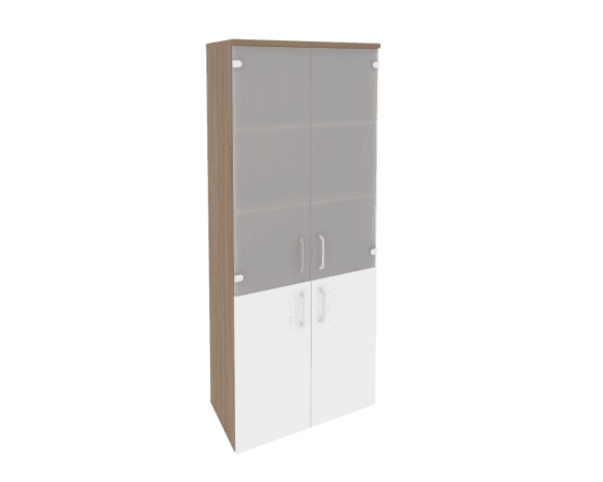 Шкаф высокий широкий (2 низких фасада ЛДСП + 2 средних фасада стекло) фасад белый бриллиант, дуб аризона