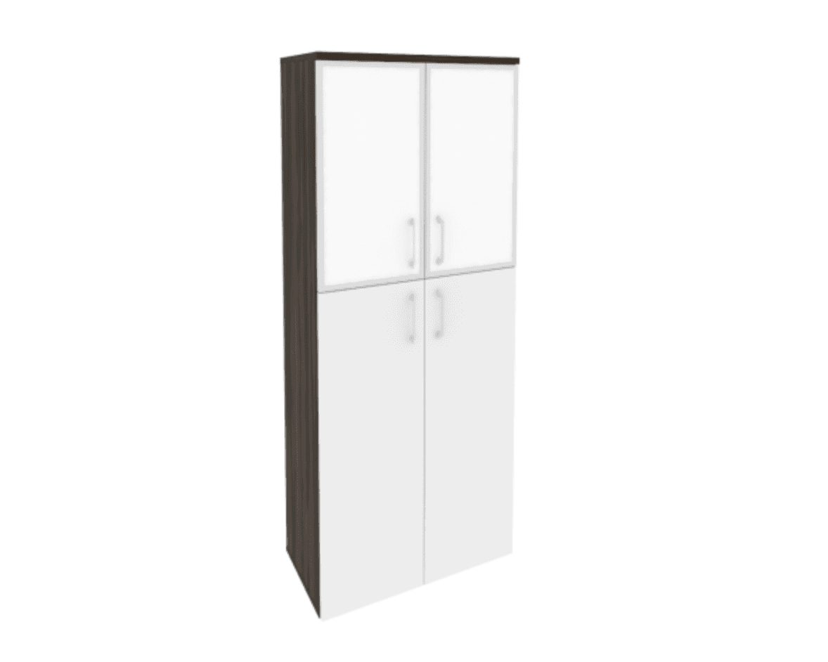 Шкаф высокий широкий (2 средних фасада ЛДСП + 2 низких фасада стекло лакобель в раме) фасад белый бриллиант, дуб мали