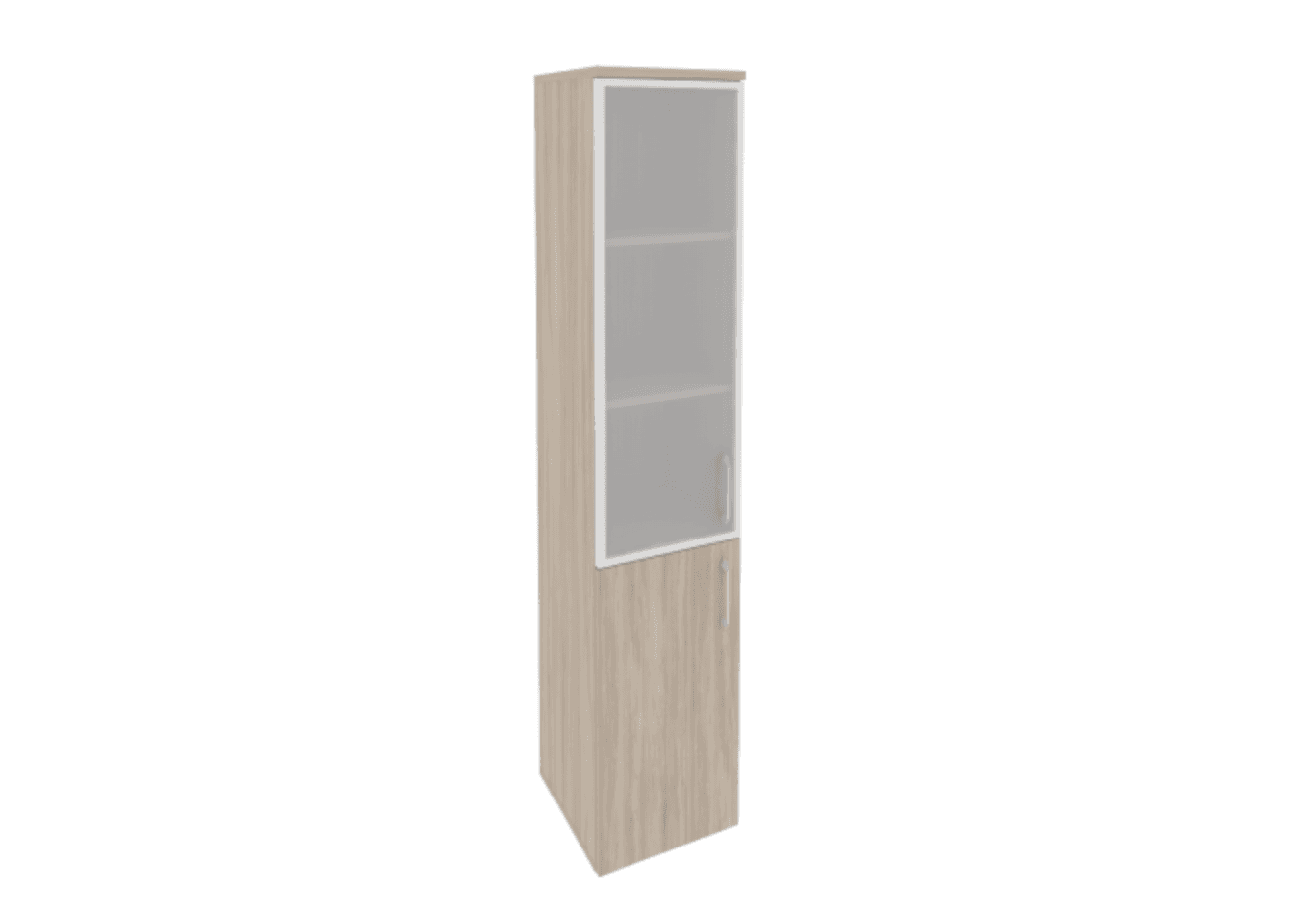 Шкаф высокий узкий левый/правый (1 низкий фасад ЛДСП + 1 средний фасад стекло в раме), дуб аттик