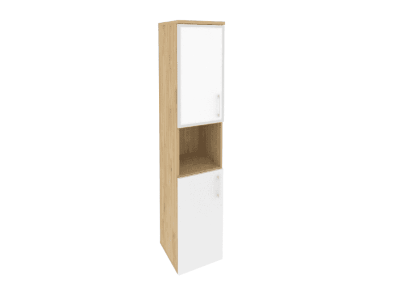 Шкаф высокий узкий левый/правый (1 низкий фасад ЛДСП белый бриллиант + 1 низкий фасад стекло лакобель в раме), тиквуд светлый