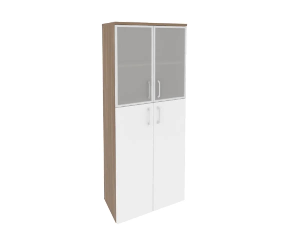 Шкаф высокий широкий (2 средних фасада ЛДСП + 2 низких фасада стекло в раме) фасад белый бриллиант дуб аризона