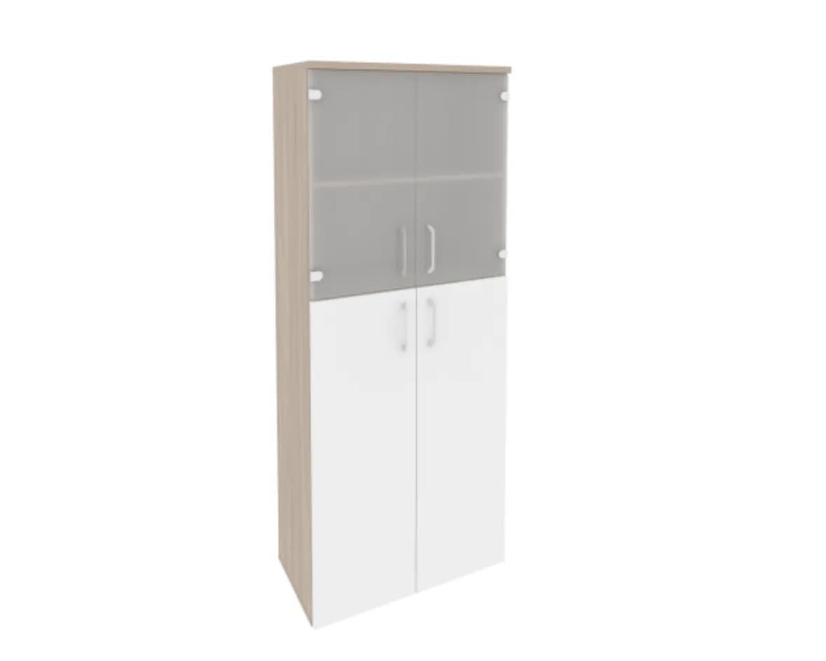 Шкаф высокий широкий (2 средних фасада ЛДСП + 2 низких фасада стекло) фасад белый бриллиант дуб аттик