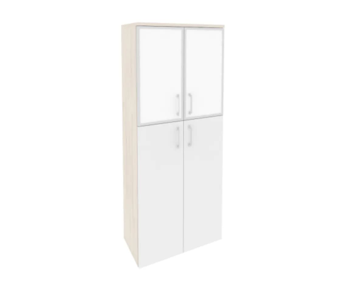 Шкаф высокий широкий (2 средних фасада ЛДСП + 2 низких фасада стекло лакобель в раме) фасад белый бриллиант денвер светлый
