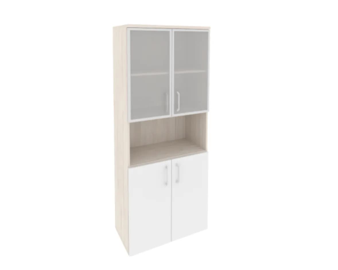 Шкаф высокий широкий (2 низких фасада ЛДСП + 2 низких фасада стекло в раме) фасад белый бриллиант денвер светлый
