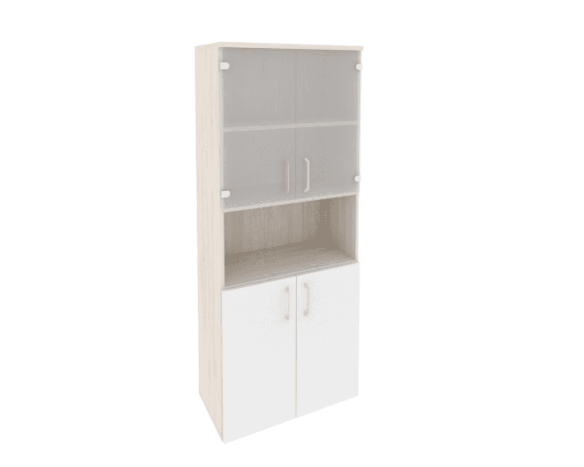 Шкаф высокий широкий (2 низких фасада ЛДСП + 2 низких фасада стекло) фасад белый бриллиант, денвер светлый