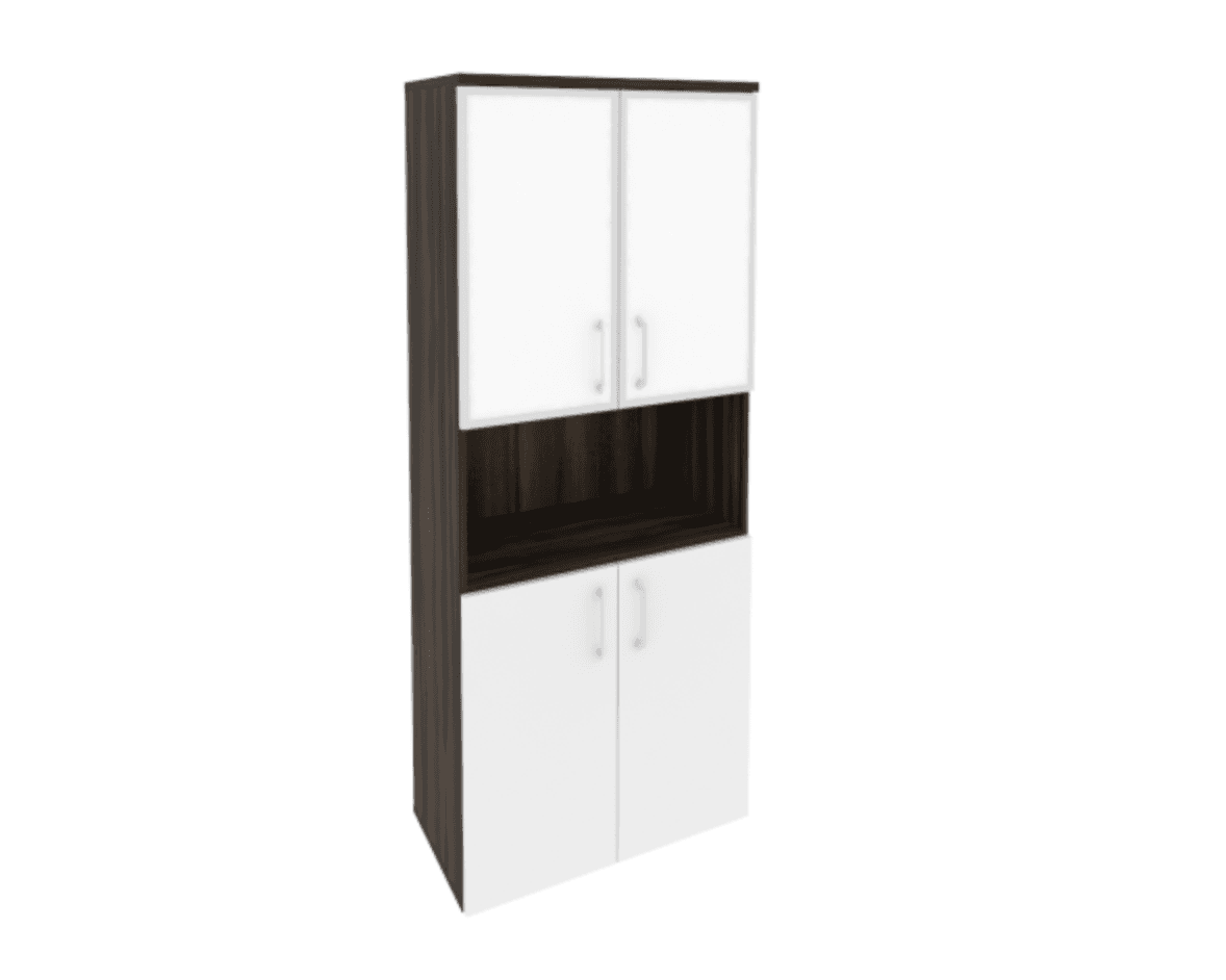 Шкаф высокий широкий (2 низких фасада ЛДСП + 2 низких фасада стекло лакобель в раме) фасад белый бриллиант, дуб мали