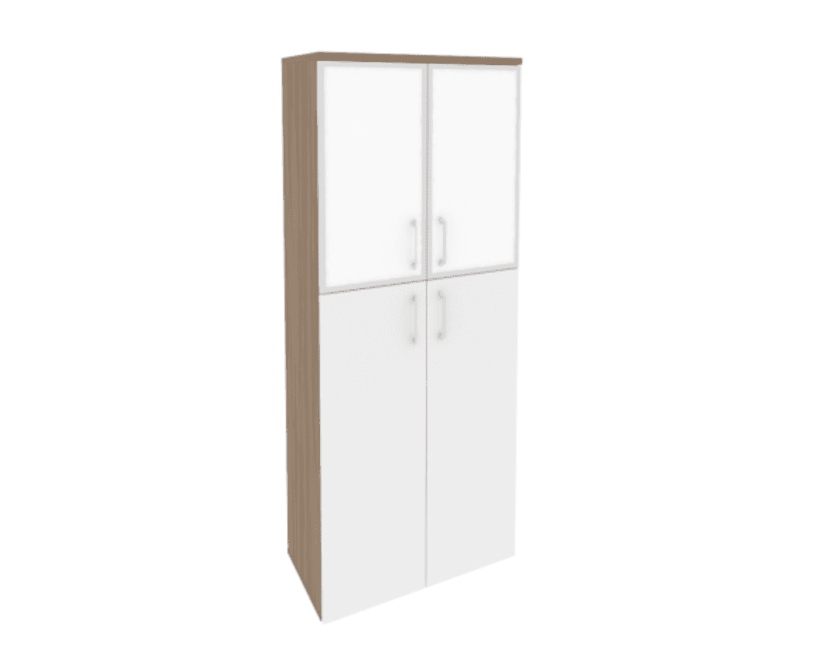 Шкаф высокий широкий (2 средних фасада ЛДСП + 2 низких фасада стекло лакобель в раме) фасад белый бриллиант, дуб аризона