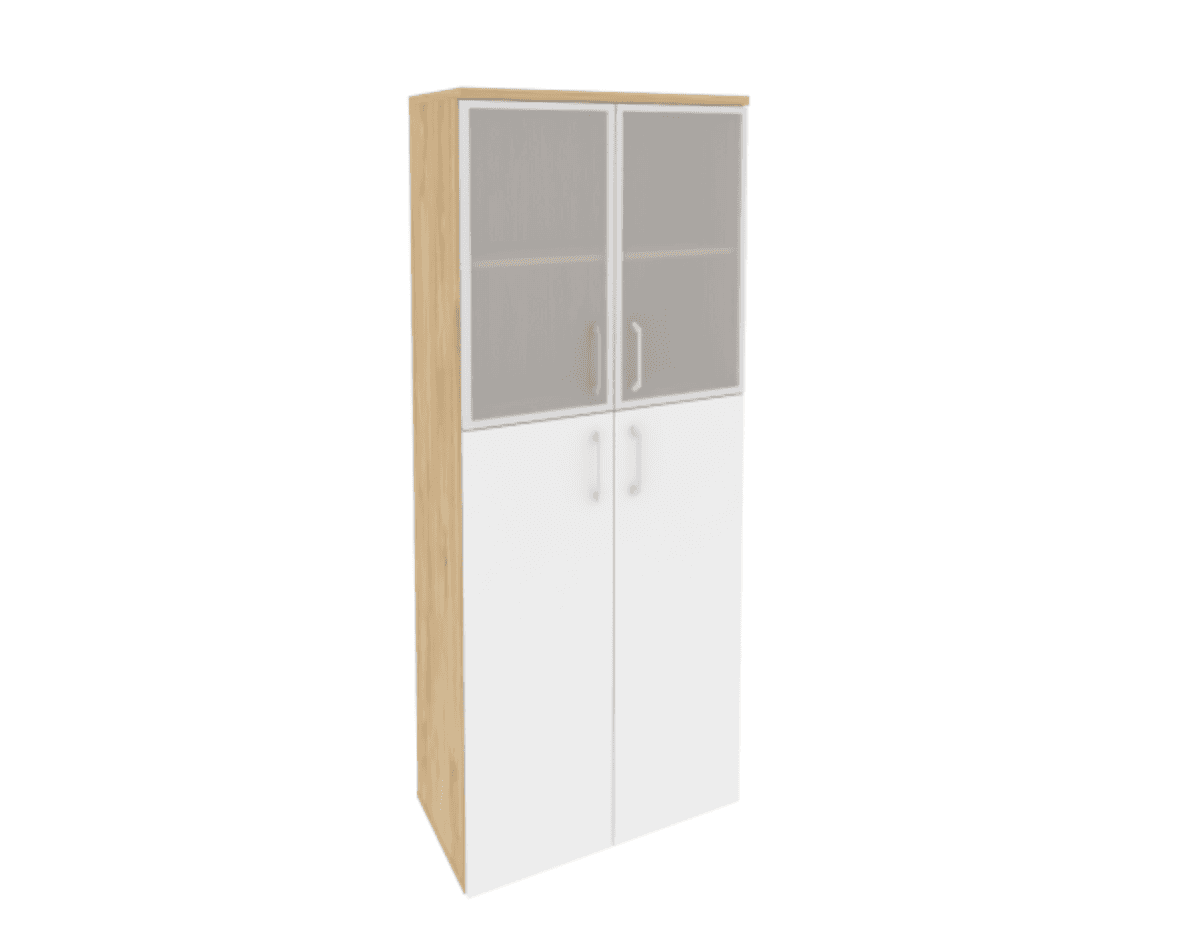 Шкаф высокий широкий (2 средних фасада ЛДСП + 2 низких фасада стекло в раме) фасад белый бриллиант, тиквуд светлый