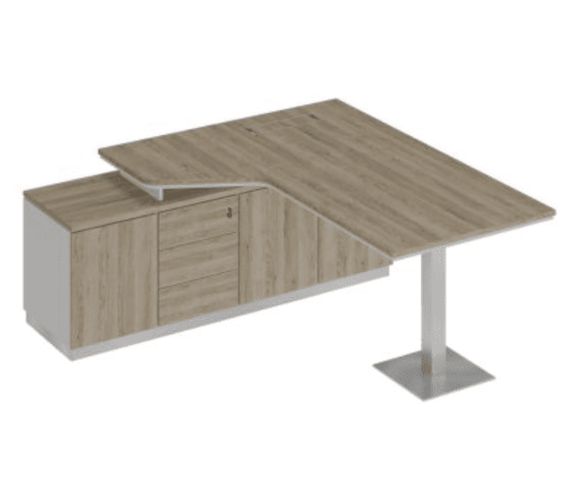 Стол руководителя эргономичный на опорной тумбе левый, дуб светлый/белый/дуб светлый