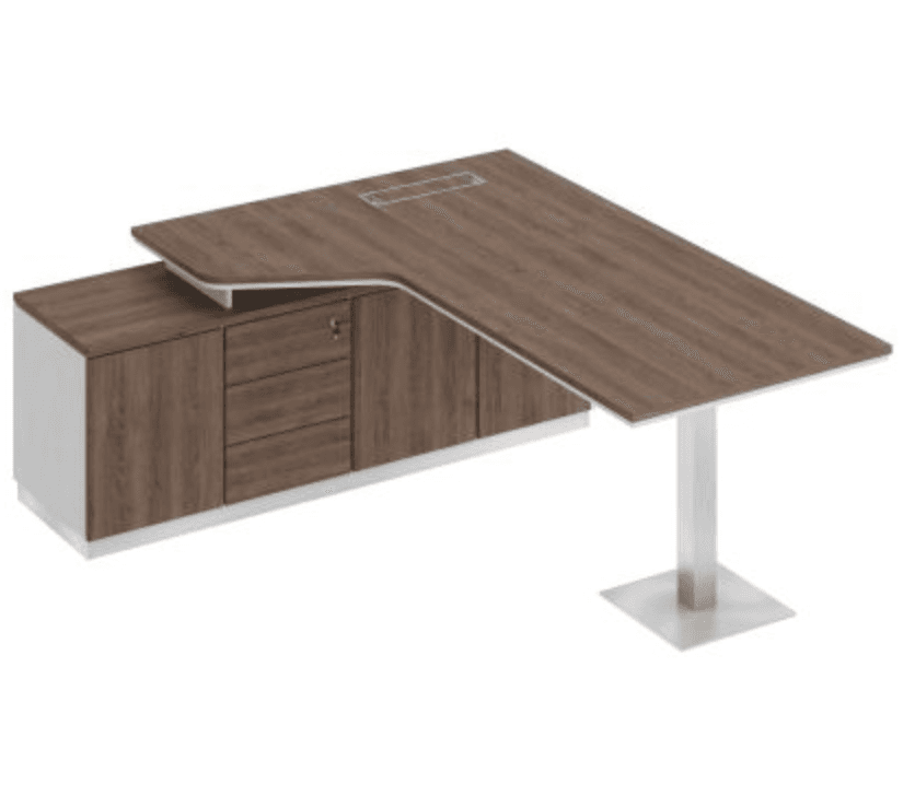 Стол руководителя эргономичный на опорной тумбе левый, дуб тёмный/белый/дуб тёмный
