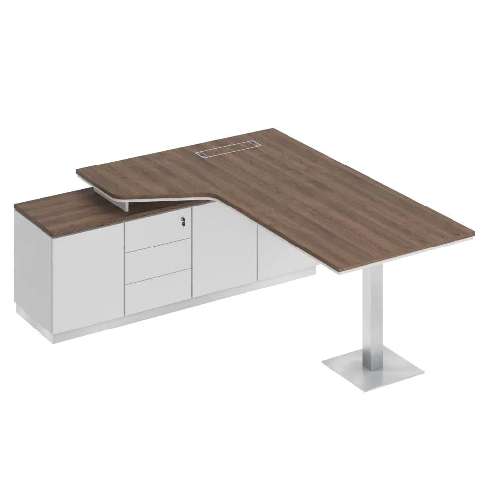 Стол руководителя эргономичный на опорной тумбе левый дуб тёмный/белый/белый