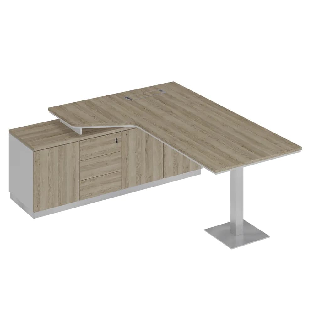 Стол руководителя эргономичный на опорной тумбе левый дуб светлый/белый/дуб светлый