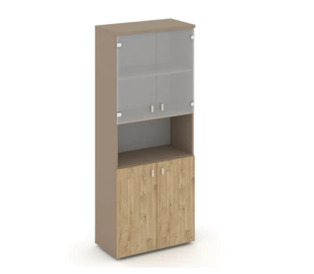 Шкаф высокий широкий (2 низких фасада ЛДСП + 2 низких фасада стекло сатин матовый) - основание латте тиквуд светлый