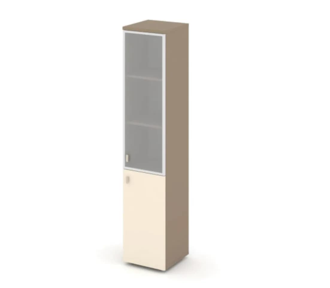 Шкаф высокий узкий левый/правый (1 низкий фасад ЛДСП + 1 средний фасад стекло в раме сатин матовый) - основание латте