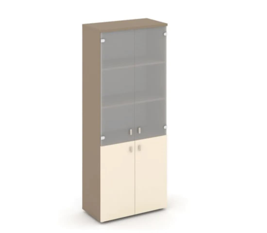 Шкаф высокий широкий (2 низких фасада ЛДСП + 2 средних фасада стекло сатин матовый) - основание латте