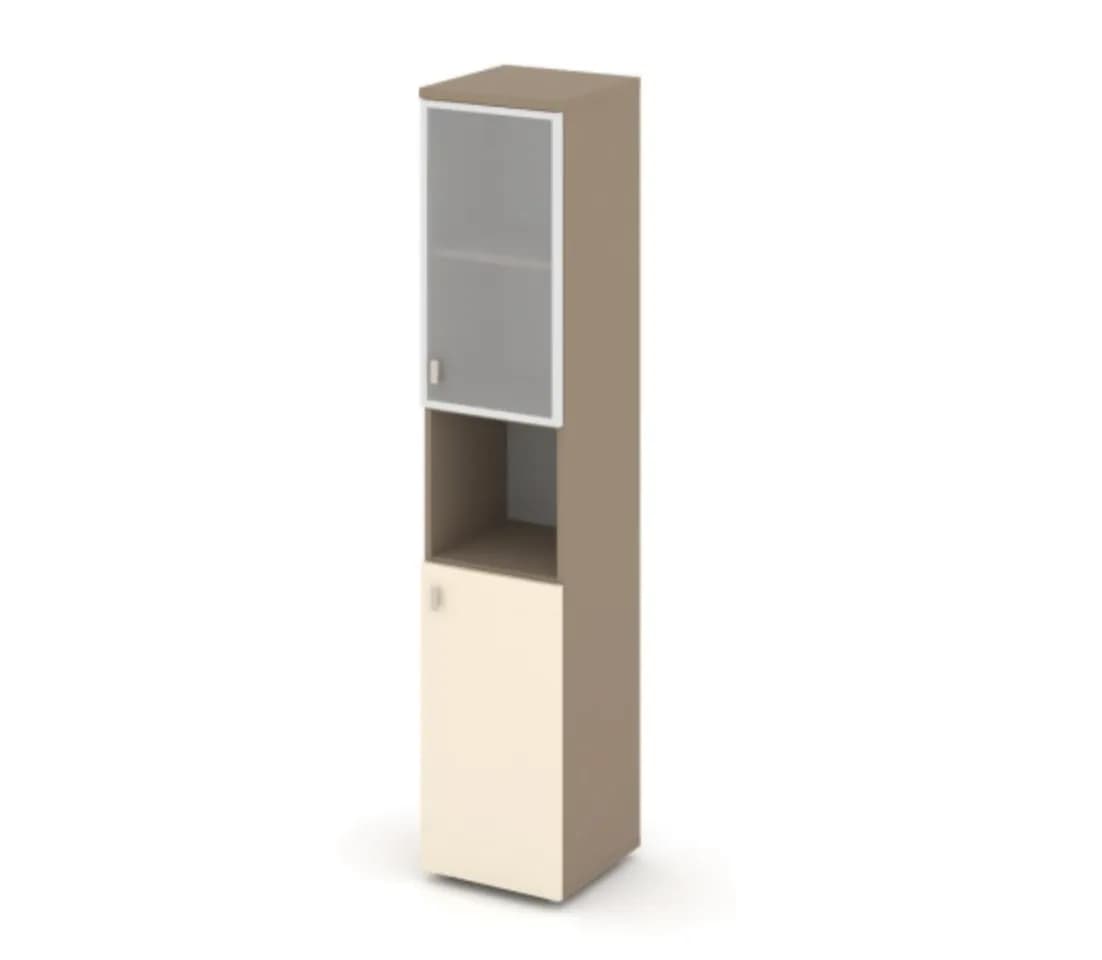 Шкаф высокий узкий левый/правый (1 низкий фасад ЛДСП + 1 низкий фасад стекло в раме сатин матовый) - основание латте