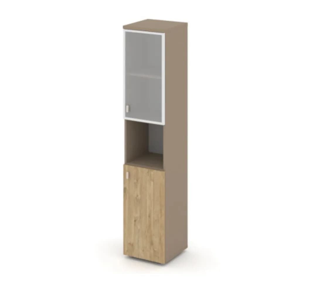 Шкаф высокий узкий левый/правый (1 низкий фасад ЛДСП + 1 низкий фасад стекло в раме сатин матовый) - основание латте тиквуд светлый