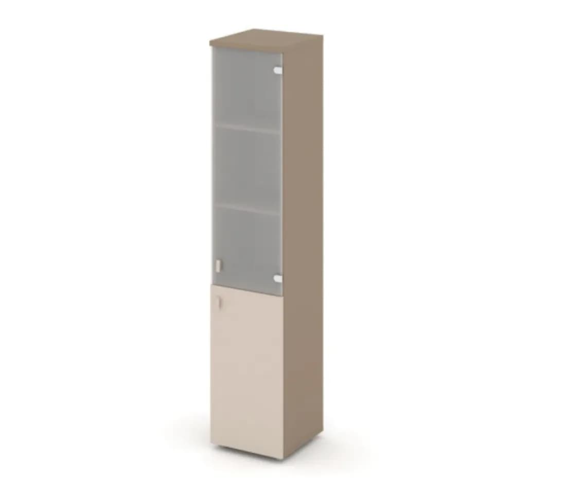 Шкаф высокий узкий левый/правый (1 низкий фасад ЛДСП + 1 средний фасад стекло сатин матовый) - основание латте капучино