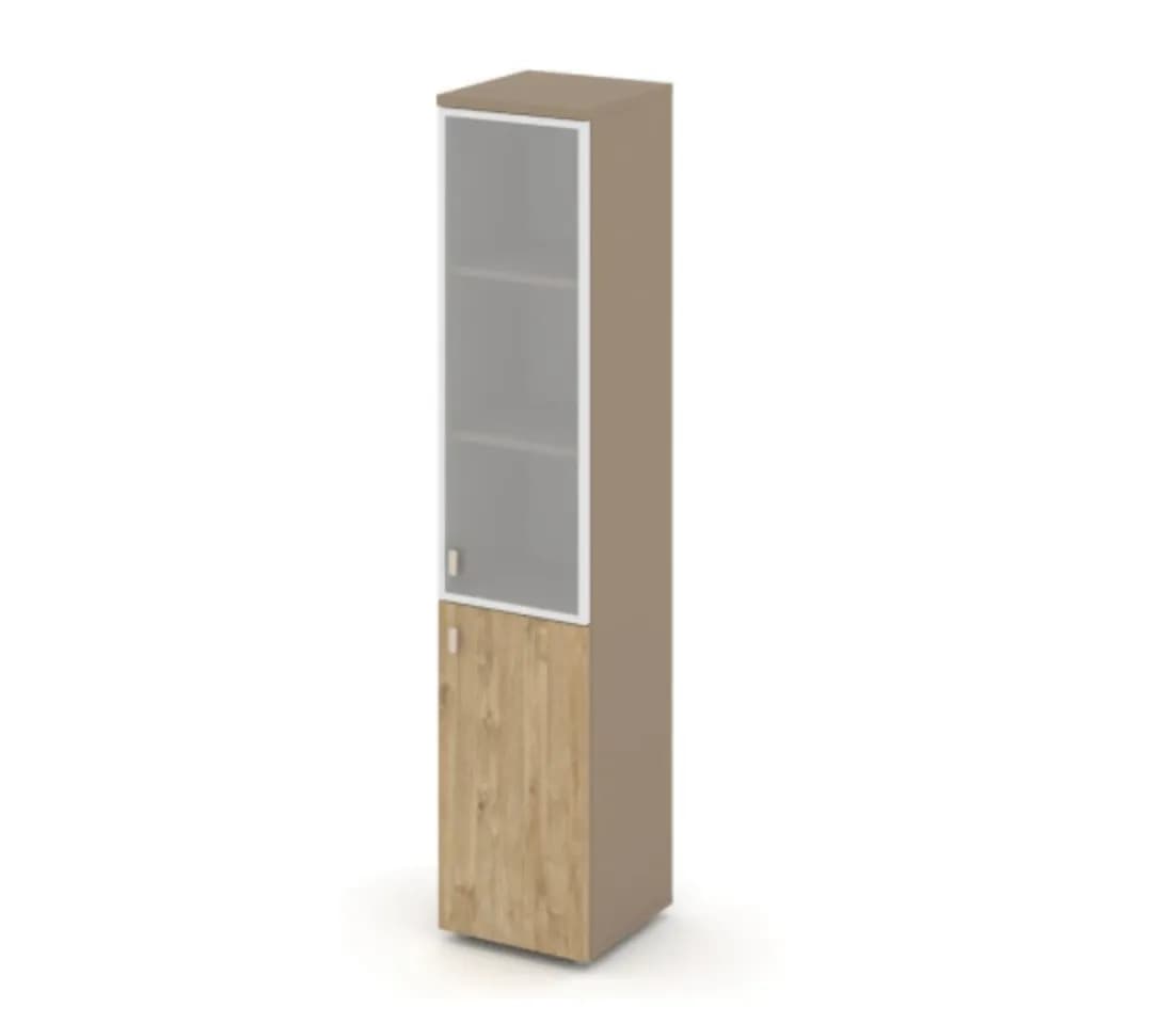 Шкаф высокий узкий левый/правый (1 низкий фасад ЛДСП + 1 средний фасад стекло в раме сатин матовый) - основание латте тиквуд светлый