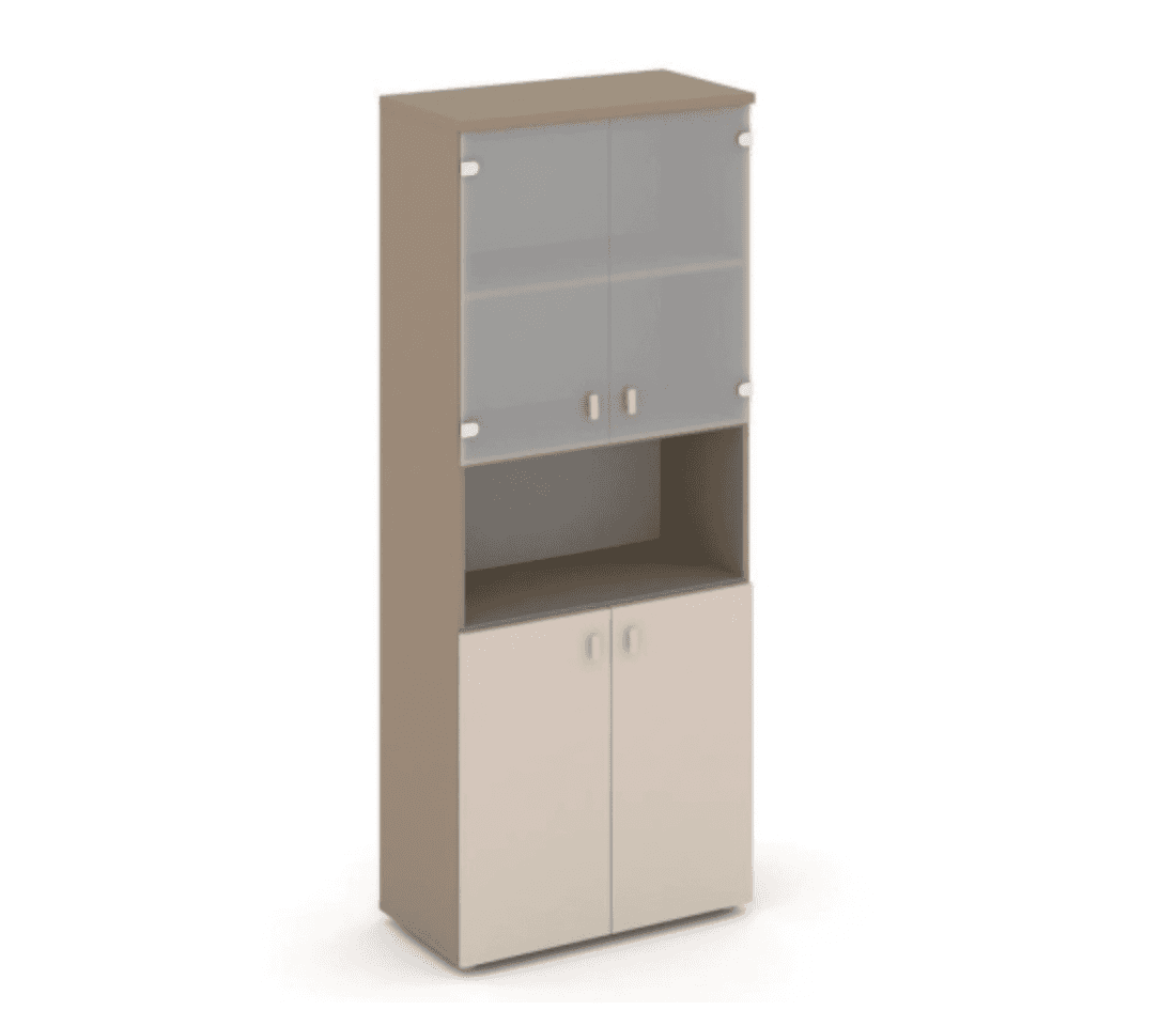 Шкаф высокий широкий (2 низких фасада ЛДСП + 2 низких фасада стекло сатин матовый) - основание латте, капучино