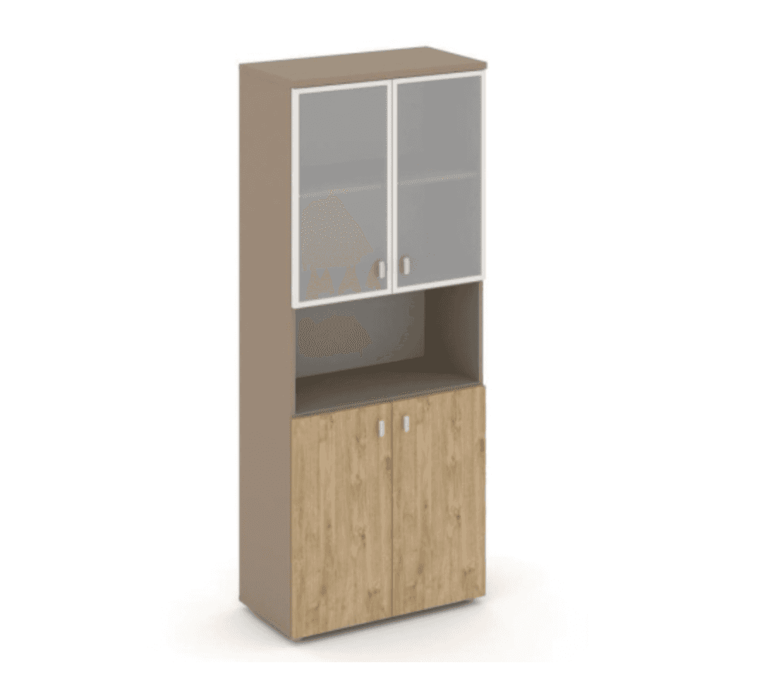 Шкаф высокий широкий (2 низких фасада ЛДСП + 2 низких фасада стекло в раме сатин матовый) - основание латте, тиквуд светлый