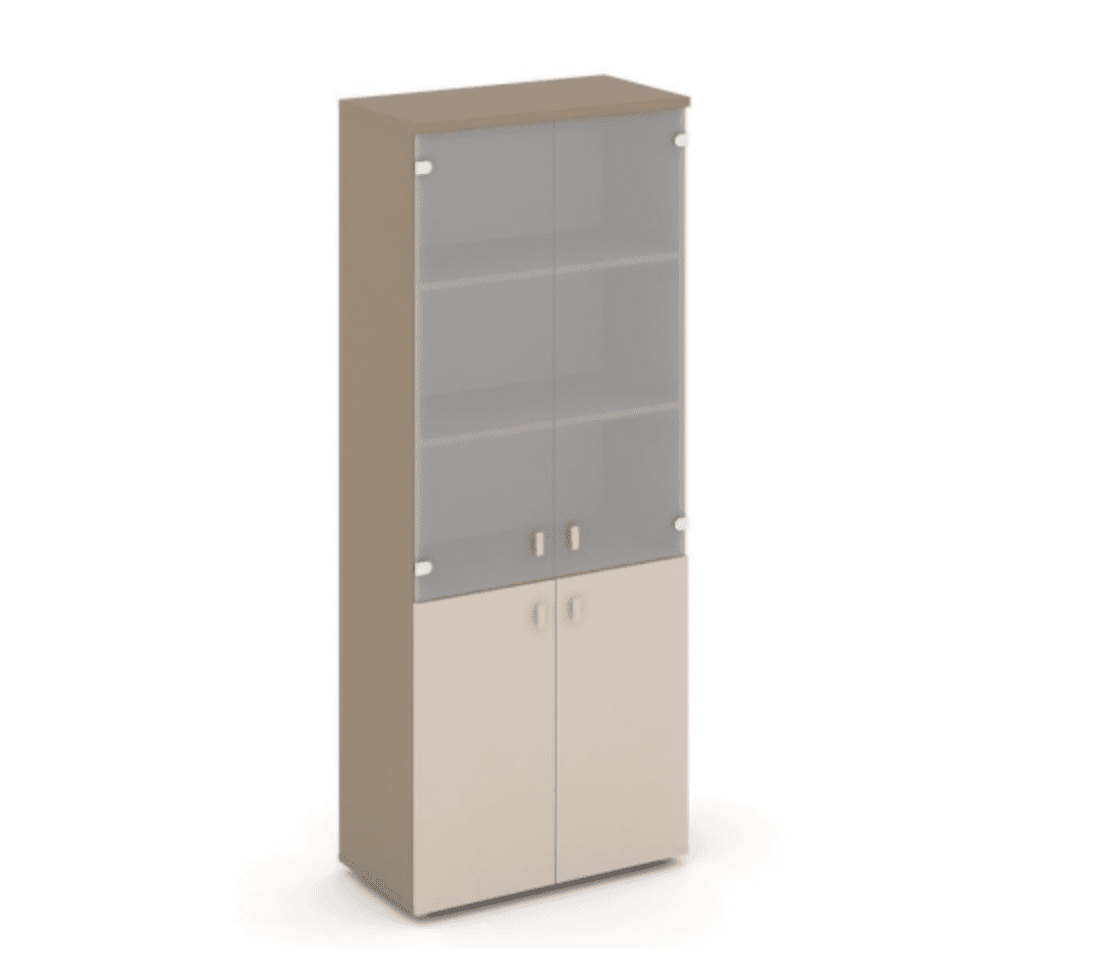 Шкаф высокий широкий (2 низких фасада ЛДСП + 2 средних фасада стекло сатин матовый) - основание латте, капучино