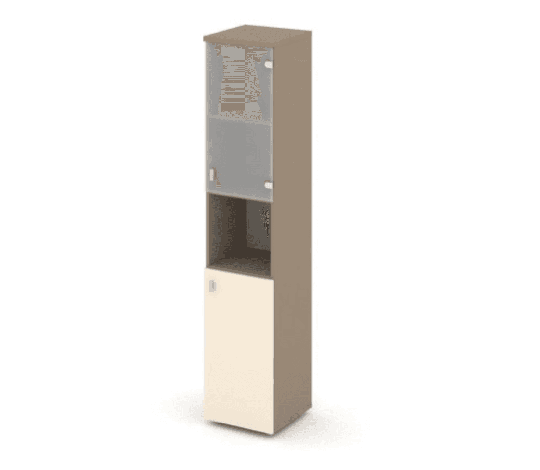 Шкаф высокий узкий левый/правый (1 низкий фасад ЛДСП + 1 низкий фасад стекло сатин матовый) - основание латте, сатин