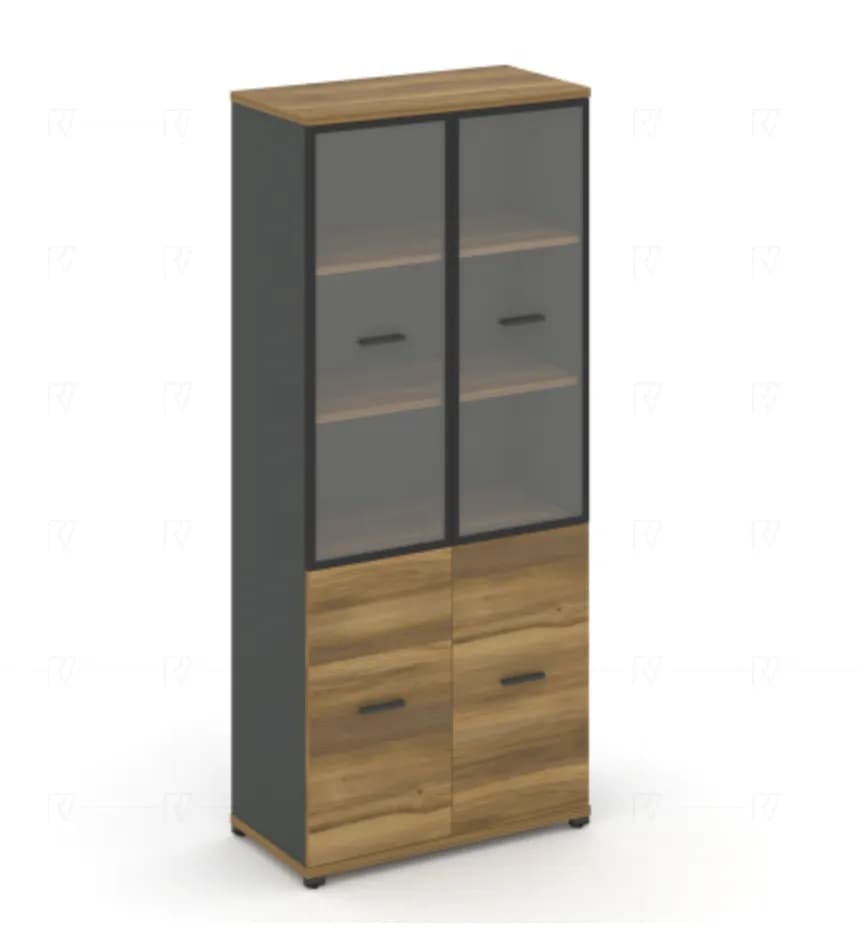 Шкаф одна широкая секция, 5 ниш (2 фасада ЛДСП, 2 ниши + 2 фасада стекло прозрачное в раме, 3 ниши) - антрацит сандал янтарный