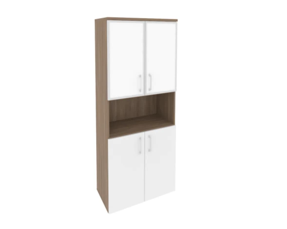 Шкаф высокий широкий (2 низких фасада ЛДСП + 2 низких фасада стекло лакобель в раме) фасад белый бриллиант дуб аризона