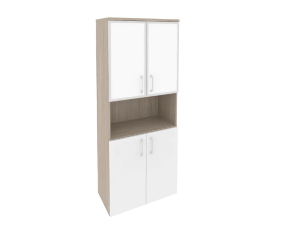Шкаф высокий широкий (2 низких фасада ЛДСП + 2 низких фасада стекло лакобель в раме) фасад белый бриллиант дуб аттик